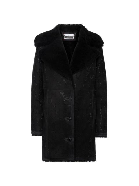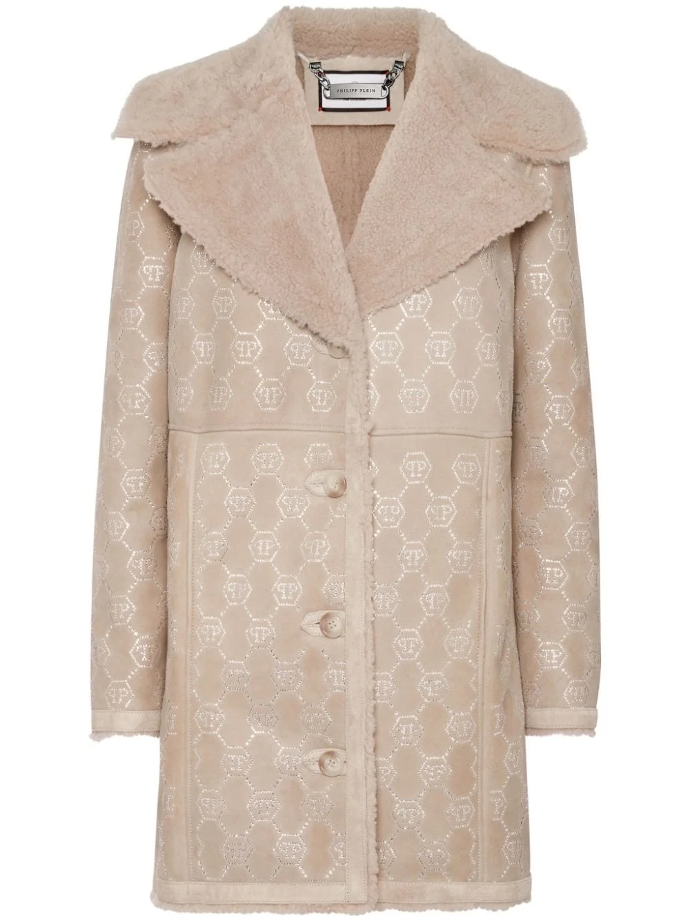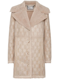 monogram-pattern coat Highlights - Beige - Shearling - Embossed monogram pattern - Front button fastening - Long sleeves - Slip pockets to the sides - Straight hem - Thigh-length Imported Composition Sheep Skin/Shearling 100%