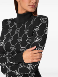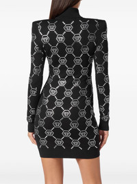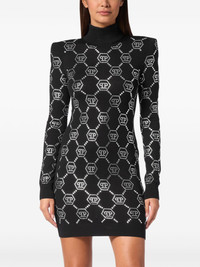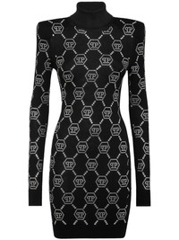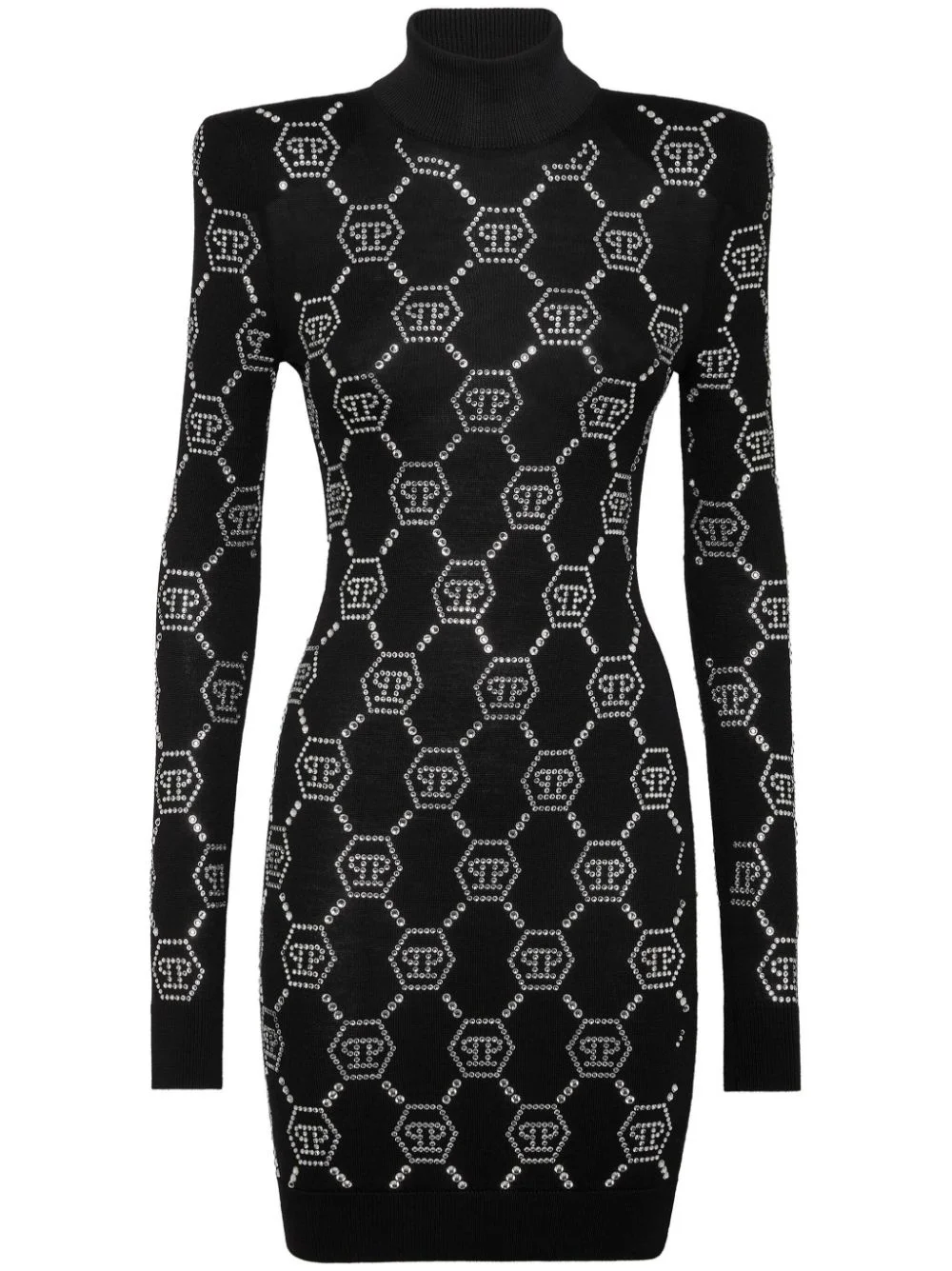 crystal-embellished monogram mini dress Highlights - Black - Wool - Knitted construction - Monogram pattern - Crystal embellishment - High neck - Shoulder pads - Long sleeves - Ribbed trim - Straight hem - Above-knee length Made in Italy Composition Wool 100%