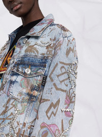 monogram tattoo-print oversize denim jacket Philipp Plein's oversized denim jacket is presented as part of the label's SS22 collection with an eye-catching monogram tattoo print. Eye-catching crystal embellishments add extra interest to this everyday piece. Imported Composition Outer: Cotton 100% Lining: Polyester 65%, Cotton 35% Washing instructions Dry Clean Only