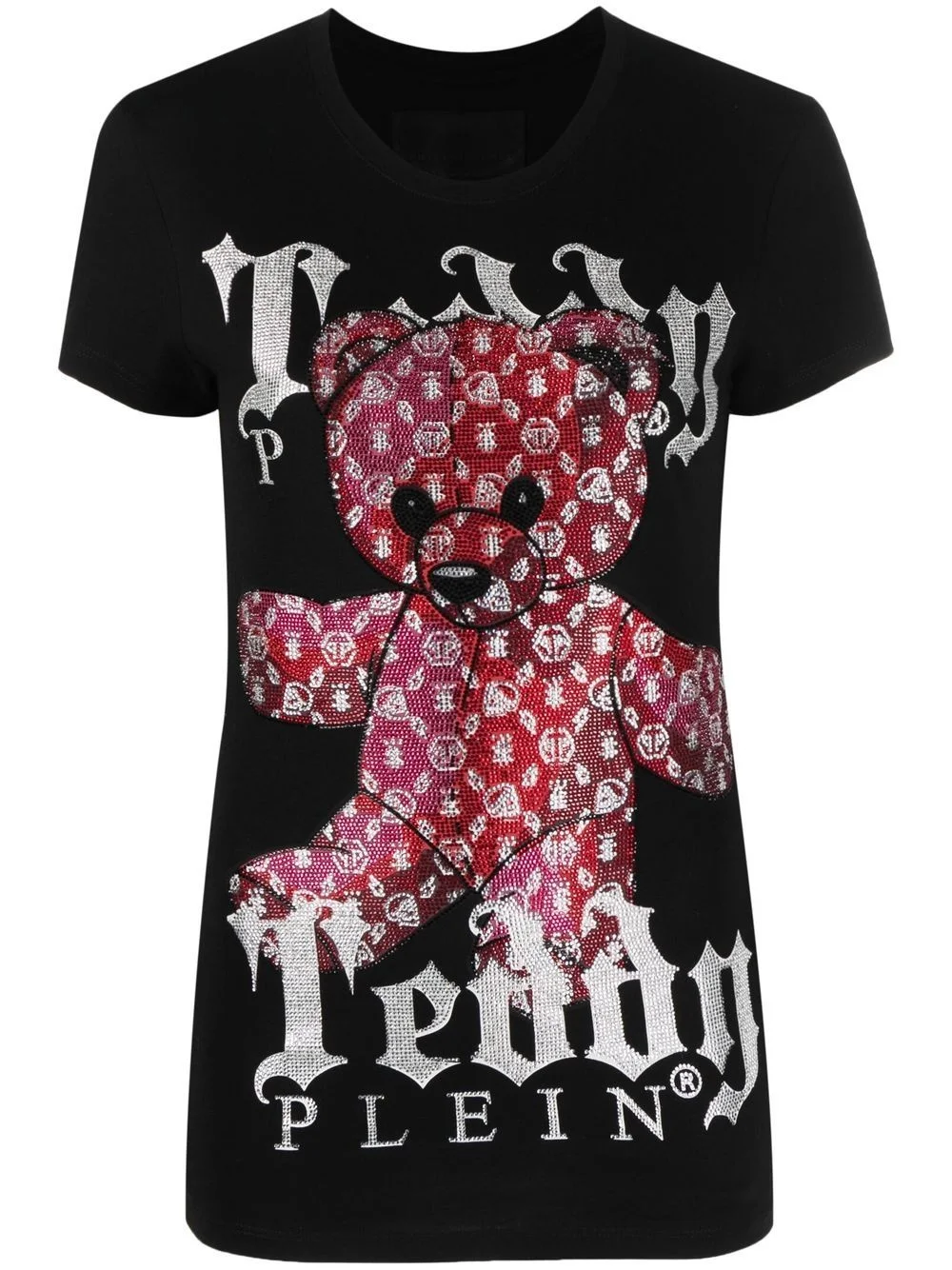 monogram teddy-print T-shirt jet black cotton logo print to the front teddy bear print round neck short sleeves straight hem Imported Composition Cotton 100%, glass 100% Washing instructions Hand Wash