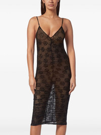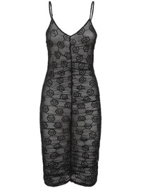 monogram tulle dress Highlights - Black - Tulle netting - Monogram pattern - Semi-sheer construction - Ruched detailing - V-neck - Spaghetti straps - Knee-length Imported Composition Polyester 85%, Spandex/Elastane 15%