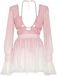 ombre-effect mini dress Highlights - Light pink/white - Silk - Ombre effect - Gathered detailing - Plunging u-neck - Lobster claw fastening - Concealed rear zip fastening - Long sleeves - Flared cuffs - Thigh-length - Ruffle hem - Straight hem Made in Italy Composition Lining: Glass Fiber 100%, Polyamide 78%, Elastane 22% Outer: Silk 100%