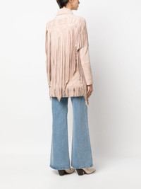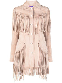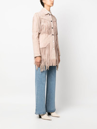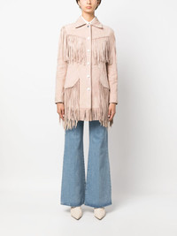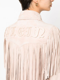 oversized fringed suede shirt jacket Highlights - Blush beige - Lambskin - Logo patch to the rear - Fringe detailing - Whipstitch trim - Spread collar - Front press-stud fastening - Long sleeves - Two side flap pockets - Thigh-length Imported Composition Lining: Polyester 97%, Elastane 3% Outer: Lambskin 100% SIZE & FIT Model measurements Height 5 ft 11 in(1.8 m) Bust/Chest 31.49 in(80 cm) Hips 35.43 in(90 cm) Waist 24.4 in(62 cm) FittingInformation Designed for a slim fit that sits just away from the body offering a close yet comfortable fit Suede leather has a soft and treated construction offering some flexibility This piece fits true to size – take your usual size Washing instructions Specialist Cleaning
