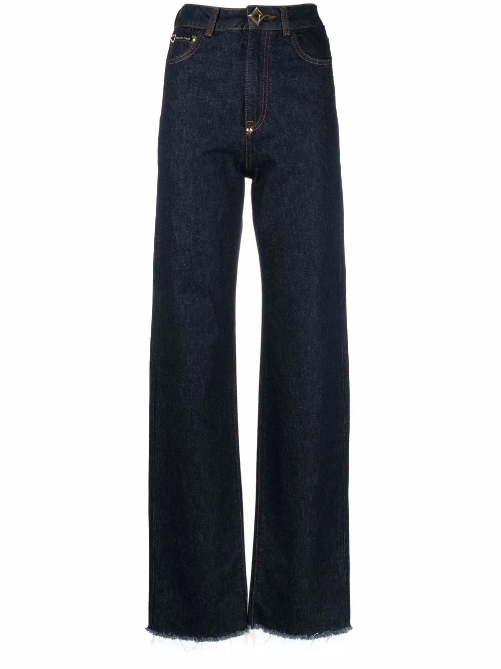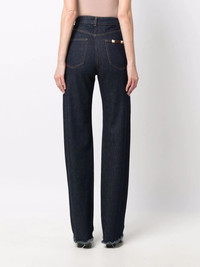 palace-fit denim jeans indigo blue cotton straight leg high-waisted mini logo tag gold-tone stud detailing frayed hem concealed fly and button fastening belt loops classic five pockets Imported Composition Outer: Cotton 100% Lining: Polyester 65%, Cotton 35% SIZE & FIT Model measurements Height 5 ft 9 in(1.75 m) Bust/Chest 32.67 in(83 cm) Hips 36.22 in(92 cm) Waist 24.8 in(63 cm) FittingInformation This piece fits small – you might want to get one size up Designed to be fitted at the waist and hips, loose over the leg Made with a mid-weight non-stretch fabric Washing instructions Dry Clean Only