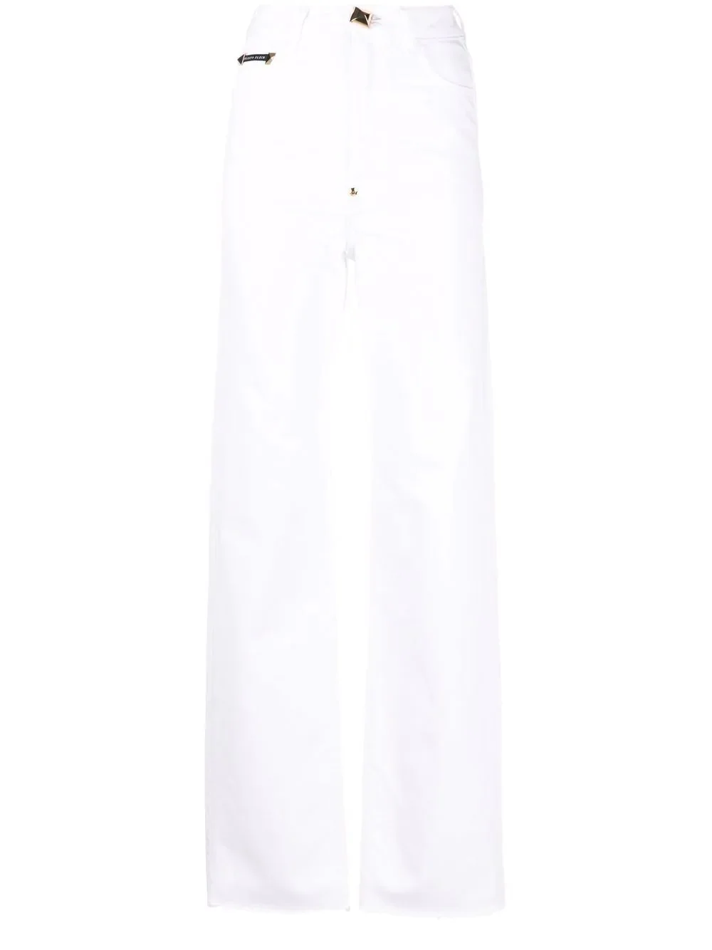 straight-leg denim jeans snow-white cotton-blend straight leg high-waisted mini logo tag gold-tone stud detailing frayed hem concealed fly and button fastening belt loops classic five pockets Imported Composition Lining: Polyester 65%, Cotton 35% Outer: Cotton 100% SIZE & FIT Model measurements Height 5 ft 9 in(1.75 m) Bust/Chest 32.67 in(83 cm) Hips 36.22 in(92 cm) Waist 24.8 in(63 cm) FittingInformation This piece fits small – you might want to get one size up Designed to be fitted at the waist and hips, loose over the leg Made with a mid-weight non-stretch fabric Washing instructions Dry Clean Only