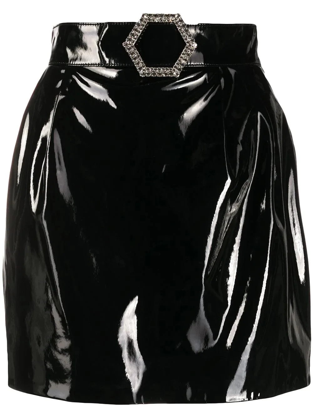 patent mini skirt Highlights - Black - Patent - Rhinestone embellishment - High waist - Belted waist - Rear zip fastening - Thigh-length Imported Composition Outer: Polyurethane 51%, Polyester 49% Lining: Polyester 97%, Spandex/Elastane 3% SIZE & FIT Model measurements Height 5 ft 9 in(1.75 m) Bust/Chest 32.67 in(83 cm) Hips 36.22 in(92 cm) Waist 24.8 in(63 cm) FittingInformation This piece fits true to size. We recommend you get your regular size Cut for a slim fit Designed for a close fit at the waist. If you like a looser fit, get one size up Made with a mid-weight fabric Washing instructions Dry Clean Only