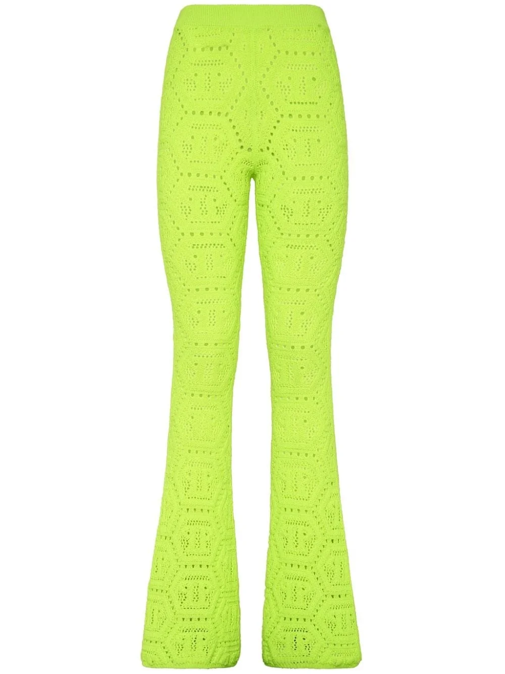 patterned-knit flared trousers Highlights - Fluorescent yellow - Wool blend - Patterned intarsia knit - Perforated detailing - Slip-on style - Flared design Made in Italy Composition Acrylic 50%, Wool 50% Washing instructions Read Manufacturer Guidelines