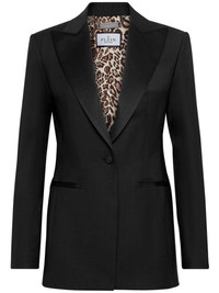 peak-lapels single-breasted blazer Highlights - Jet black - Slim cut - Peak lapels - Front button fastening - Long sleeves - Buttoned cuffs - Two front welt pockets - Straight hem - Leopard print lining Made in Italy Composition Outer: Polyester 53%, Virgin Wool 43%, Elastane 4% Lining: Polyester 100%, Viscose 51%, Acetate 49%