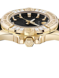 Plein Majesty 38mm Highlights - 38mm - Black - Round face - Guilloche dial - Crystal embellishment - Quartz movement - Water resistance up to 50m/5 atm - Ardillon-buckle fastening Imported
