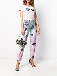 printed boyfriend jeans These 5 pocket stone washed boyfriend jeans from Philipp Plein feature an hawaiian palm trees print and embroidery with crystals. The Maison's hexagonal logo is sewn over the right rear pocket. Perfect on a night out on vacay! Made in Italy Composition Lining: Polyester 65%, Cotton 35% Outer: Cotton 100% SIZE & FIT Model measurements Height 5 ft 9 in(1.74 m) Bust/Chest 32.28 in(82 cm) Hips 35.82 in(91 cm) Waist 24.01 in(61 cm) FittingInformation This piece fits true to size. We recommend you get your regular size Designed to be fitted at the waist and hips, loose over the leg Made with a mid-weight fabric Washing instructions Hand Wash