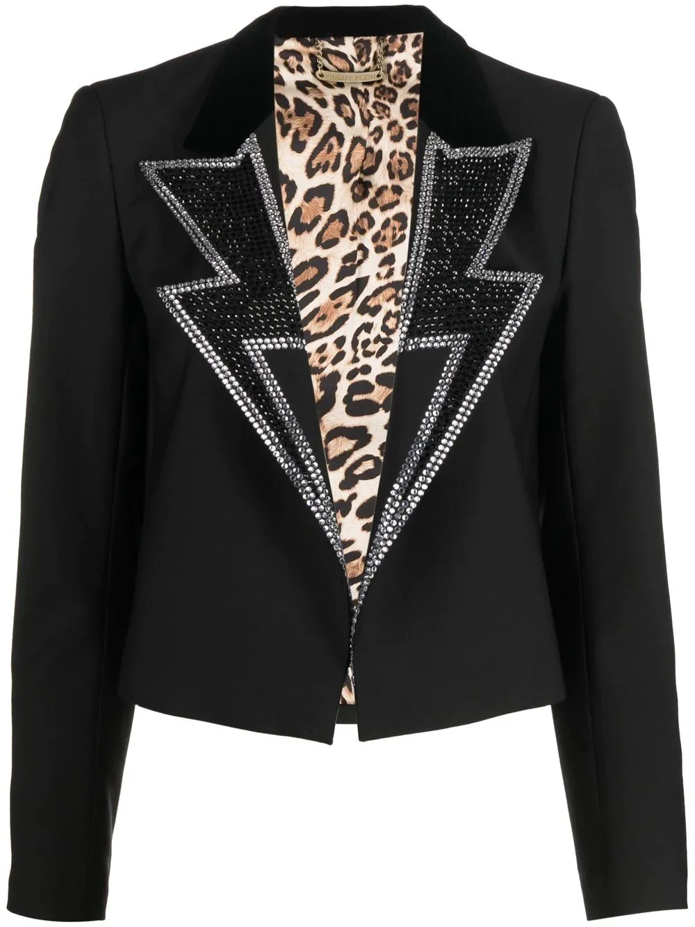 rhinestone cropped blazer black rhinestone embellishment notched lapels open front long sleeves cropped Made in Italy Composition Outer: Polyester 90%, Elastane 10% Lining: Viscose 100% SIZE & FIT Model measurements Height 5 ft 11 in(1.8 m) Bust/Chest 31.49 in(80 cm) Hips 36.61 in(93 cm) Waist 24.4 in(62 cm) FittingInformation This piece fits true to size. We recommend you get your regular size Cut for a loose fit Made with a mid-weight non-stretch fabric Washing instructions Dry Clean Only