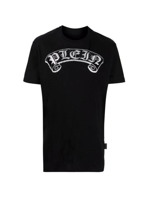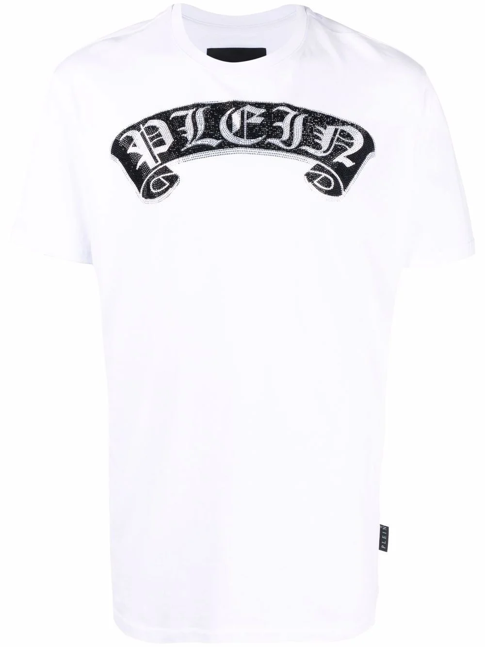 rhinestone-embellished branded T-shirt Crafted from soft white cotton, Philipp Plein's crew neck T-shirt is detailed with a rhinestone embellished script logo motif across the chest. In a unisex design, it features the brand's signature silver-tone logo plaque to the rear neckline. Imported Composition Cotton 100% SIZE & FIT Model measurements Height 5 ft 10 in(1.79 m) Bust/Chest 31.49 in(80 cm) Hips 35.03 in(89 cm) Waist 24.4 in(62 cm) FittingInformation This piece is unisex. Please take care when selecting your size Cut for a relaxed fit for both men and women Made with a mid-weight fabric