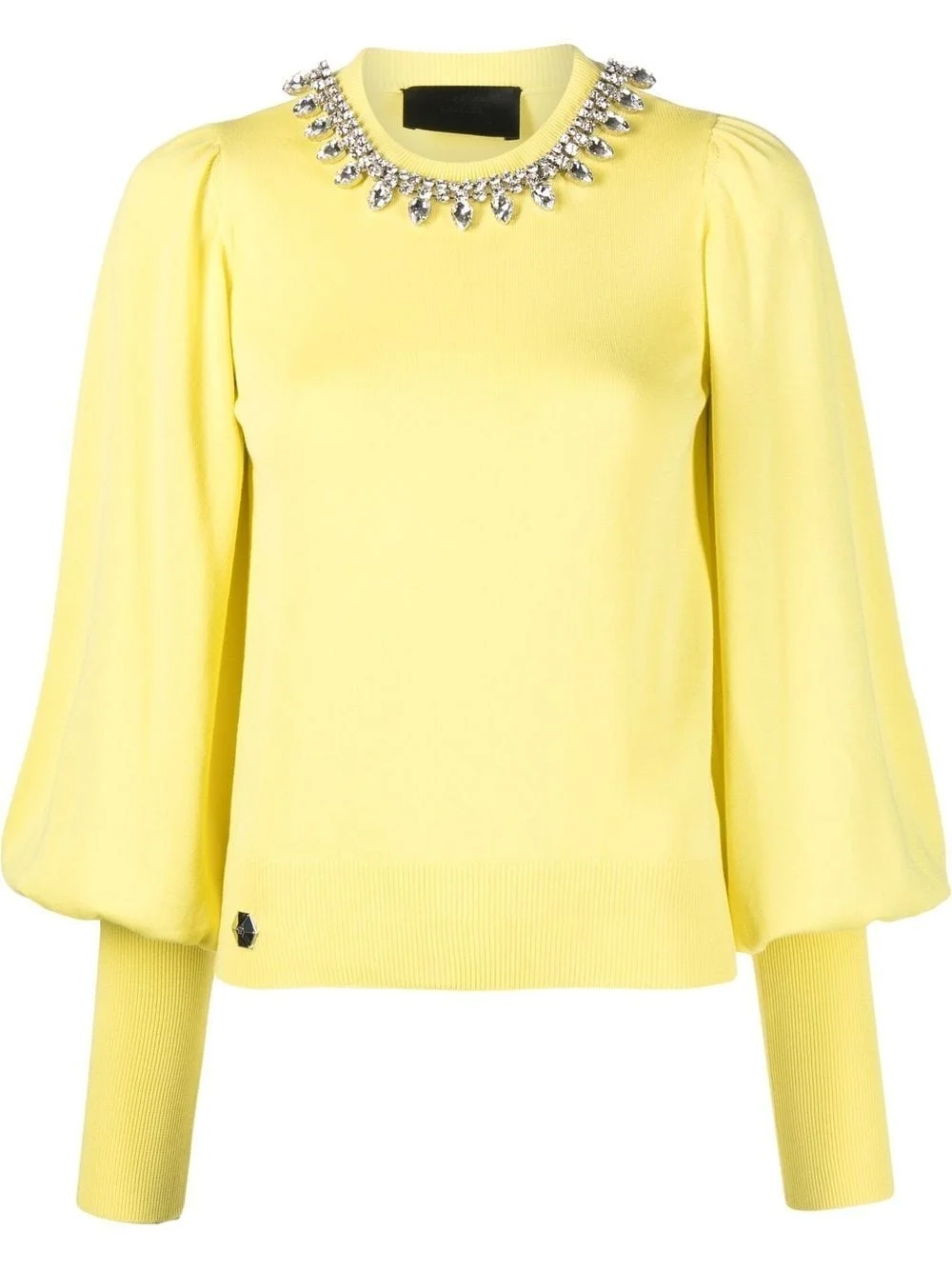 rhinestone-embellished jumper sherbet yellow cotton rhinestone embellishment fine knit long puff sleeves straight hem Made in Italy Composition Cotton 100% Washing instructions Hand Wash