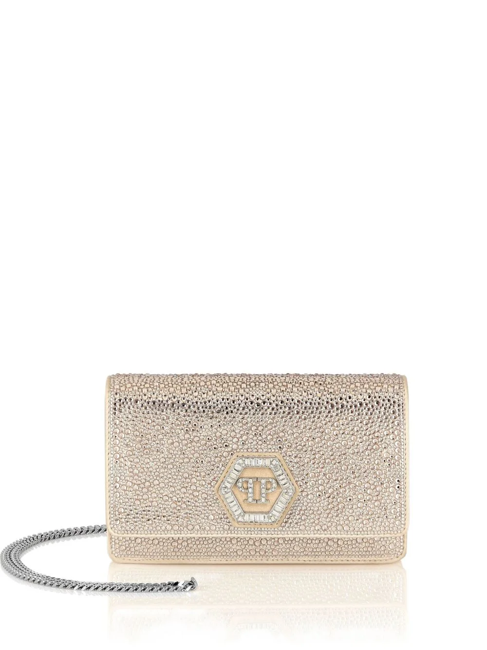 rhinestone hexagon bag Highlights - Beige - Calf leather - All-over rhinestone embellishment - Hexagon jewel logo flap - Adjustable chain strap - Internal zip pocket Made in Italy Composition Outer: Calf Leather 100%, glass 100%, Viscose 72%, Silk 28% Lining: Polyester 100%, Polyurethane 50%, Polyamide 50%