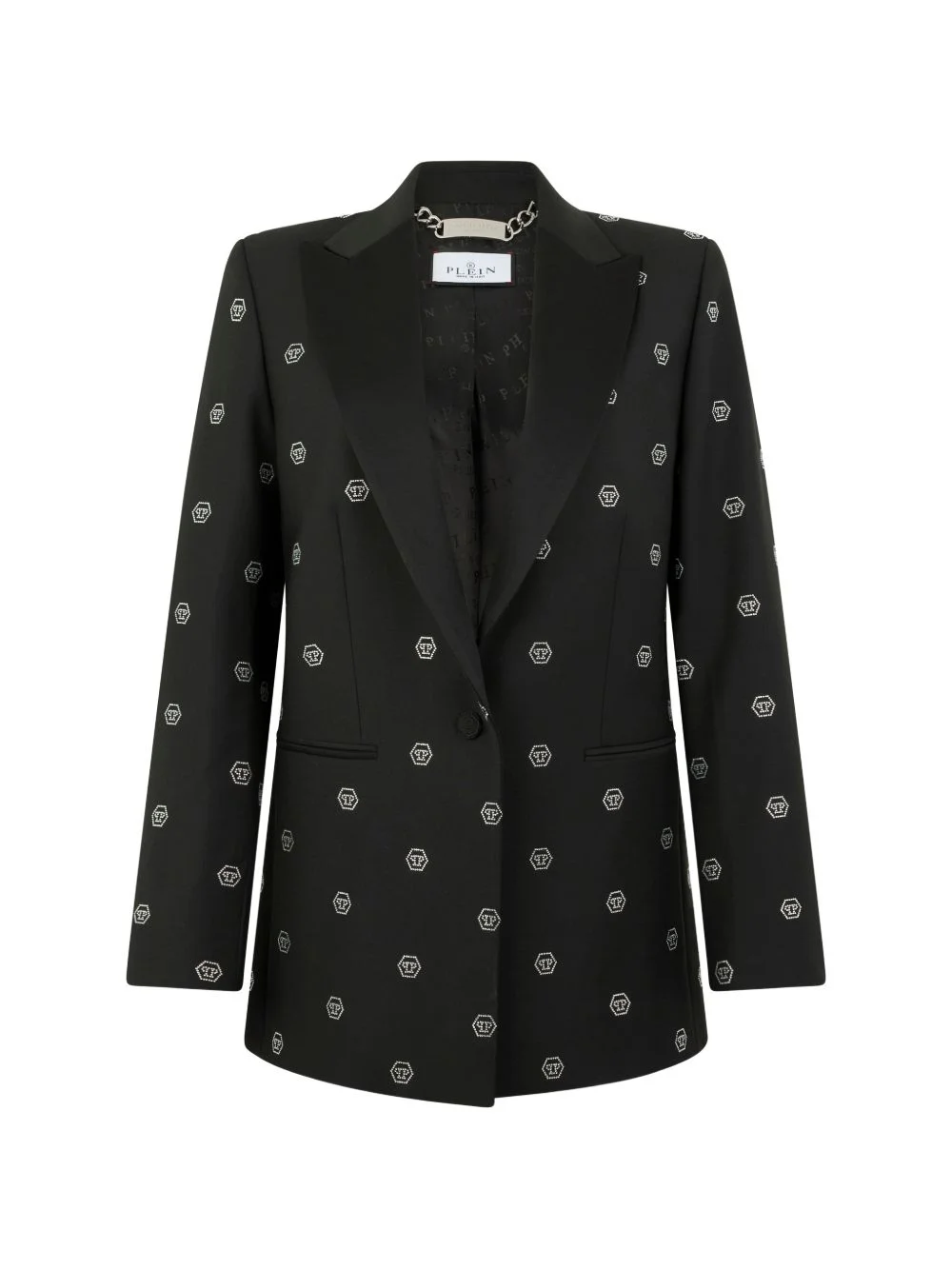 rhinestone-monogram blazer Highlights - Black - Rhinestone monogram pattern - Peak lapels - Single-breasted - Button closure - Front pockets Made in Italy Composition Outer: Polyester 53%, Virgin Wool 43%, Lycra 4% Trims: Polyester 100%, glass 100% Lining: Viscose 51%, Recycled Acetate 49% Washing instructions Read Manufacturer Guidelines