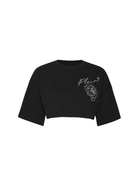 Roses crop top Highlights - Black - Cotton - Jersey texture - Crew neck - Drop shoulder - Short sleeves - Logo print at the chest - Crystal embellishment - Applique logo - Straight hem - Cropped Imported Composition Glass Fiber 100%, Cotton 100%
