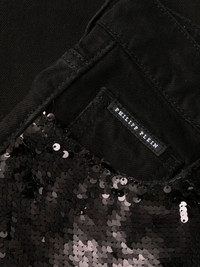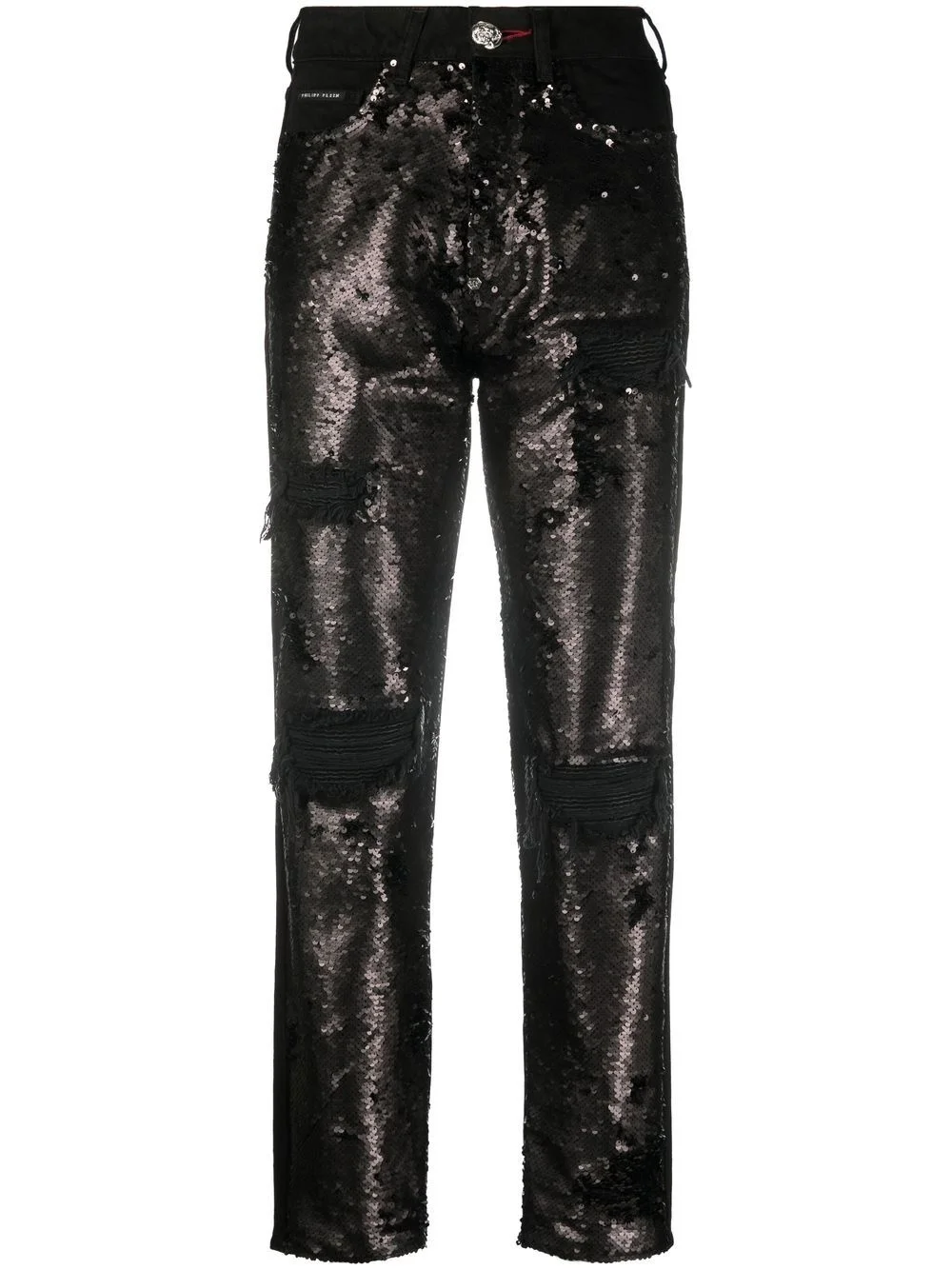 sequin-embellished high-waisted jeans Famous for the use of a dark colour pallet, Philipp Plein brings a surprisingly shimmering finish to these jeans. The design is detailed with sequins and ripped details. Imported Composition Lining: Polyester 65%, Cotton 35% Outer: Cotton 100% SIZE & FIT Model measurements Height 5 ft 10 in(1.77 m) Bust/Chest 32.67 in(83 cm) Hips 35.43 in(90 cm) Waist 23.62 in(60 cm) FittingInformation This piece fits true to size. We recommend you get your regular size Cut for a slim fit Made with a mid-weight non-stretch fabric Washing instructions Dry Clean Only