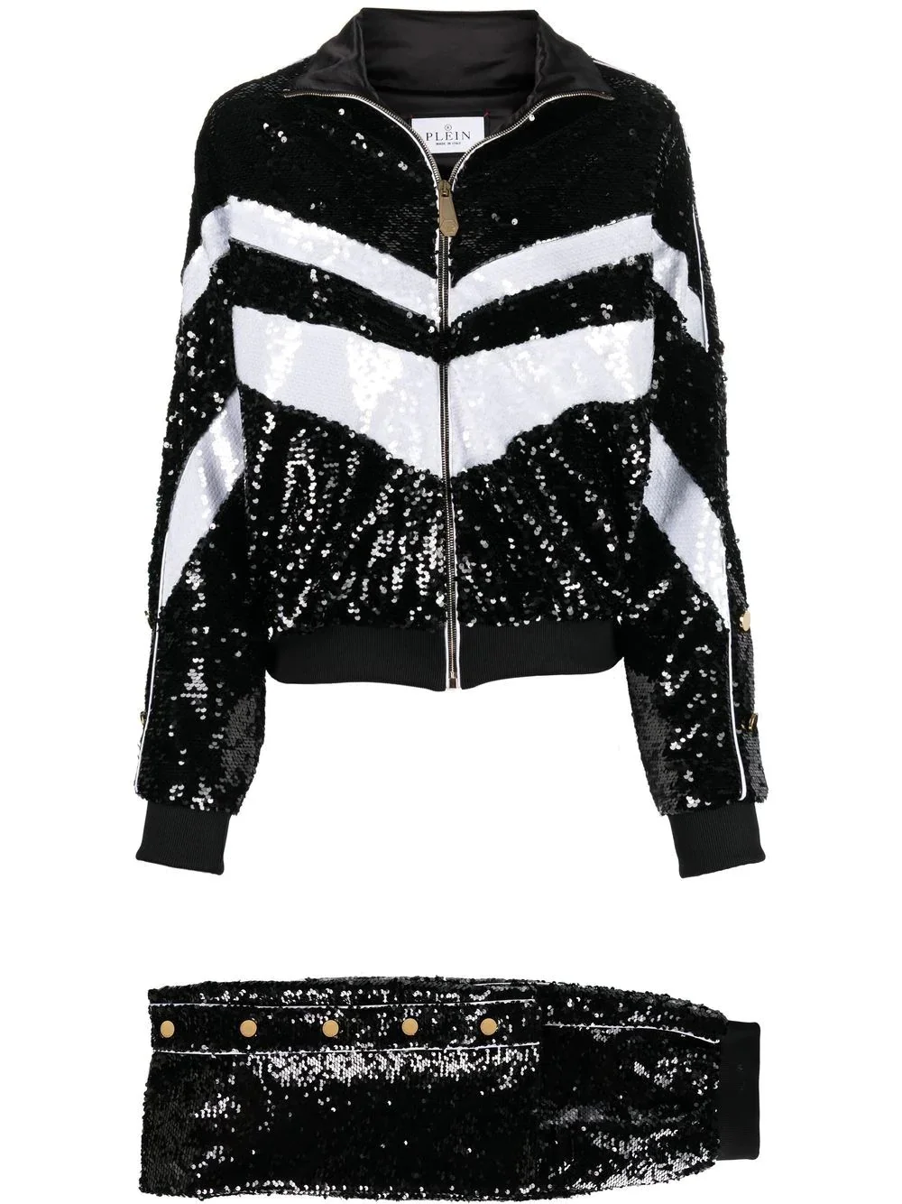 sequin embellished tracksuit Famed for their bold designs, Philipp Plein presents another in this sequin embellished tracksuit. The glimmering design adds attitude with the gold-tone button detailing, whilst the contrasting white stripe pattern reinstates an athletic tone in the piece. Made in Italy Composition Polyester 100% SIZE & FIT Model measurements Height 5 ft 11 in(1.8 m) Bust/Chest 31.49 in(80 cm) Hips 35.82 in(91 cm) Waist 24.8 in(63 cm) FittingInformation This piece fits true to size. We recommend you get your regular size Cut for a loose fit Designed to be fitted at the waist and hips, loose over the leg Made with a mid-weight fabric Washing instructions Dry Clean Only