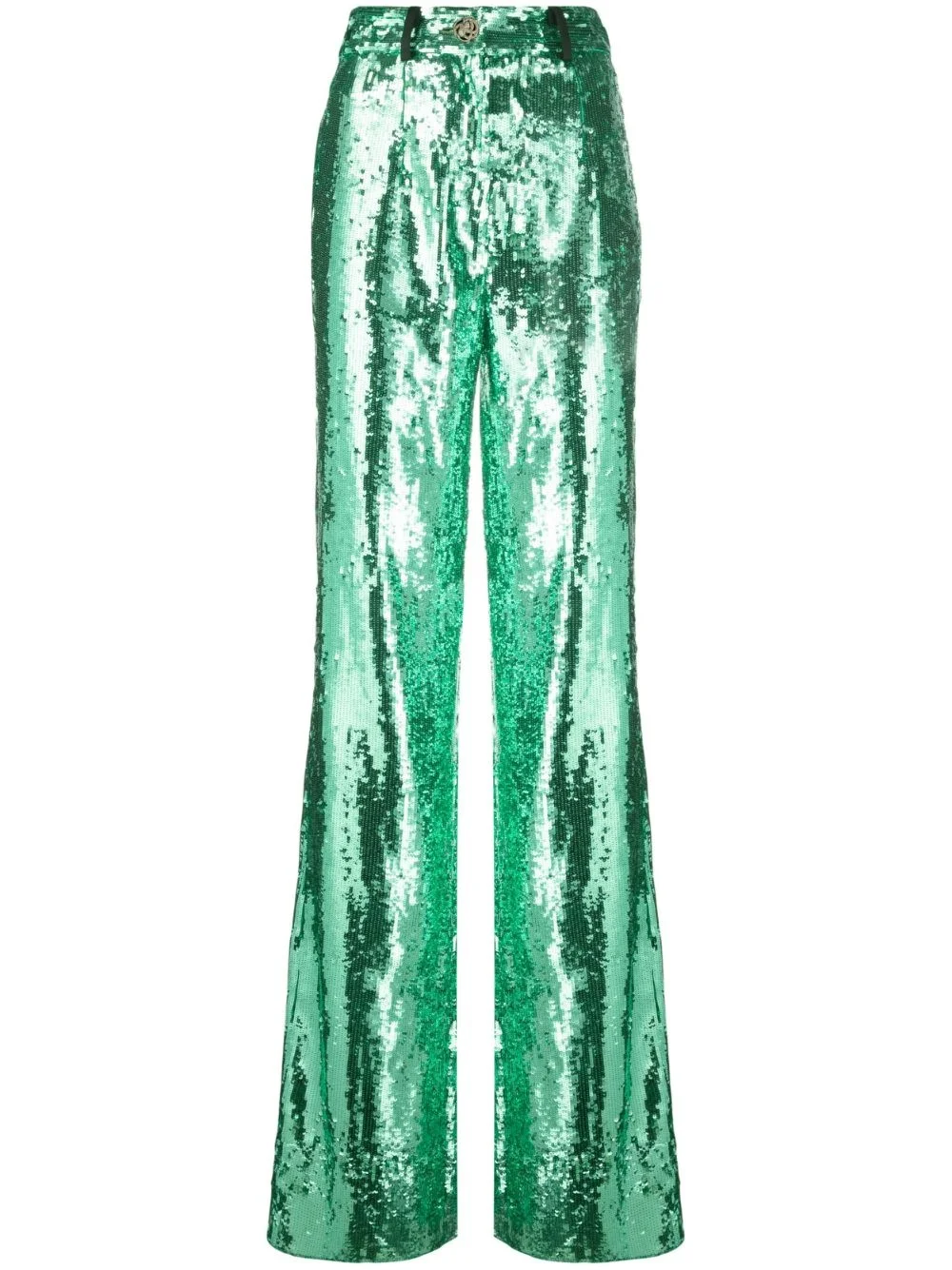 sequin-embellished wide-leg trousers sequin embellishment high waist wide leg belt loops Made in Italy Composition Polyester 100% SIZE & FIT Model measurements Height 5 ft 10 in(1.78 m) Bust/Chest 29.52 in(75 cm) Hips 35.03 in(89 cm) Waist 22.83 in(58 cm) FittingInformation This piece fits true to size. We recommend you get your regular size Designed to be fitted at the waist and hips, loose over the leg Made with a mid-weight non-stretch fabric Washing instructions Dry Clean Only
