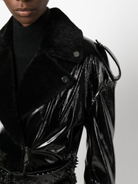 shearling-collar patent-leather jacket Highlights - Jet black - Calf leather - Patent finish - Silver-tone rockstud detailing - Shearling collar - Peak lapels - Off-centre front zip fastening - Belted waist - Drop shoulder - Long sleeves - Belted cuffs - Straight hem Imported Composition Calf Leather 100% SIZE & FIT Model measurements Height 5 ft 10 in(1.78 m) Bust/Chest 31.49 in(80 cm) Hips 37 in(94 cm) Waist 23.62 in(60 cm) FittingInformation Designed for a slim fit that sits just away from the body offering a close yet comfortable fit The belt offers adjustability for fitted preferences Firm shearling has a treated construction offering some durability This piece fits true to size – take your usual size Washing instructions Specialist Cleaning