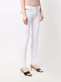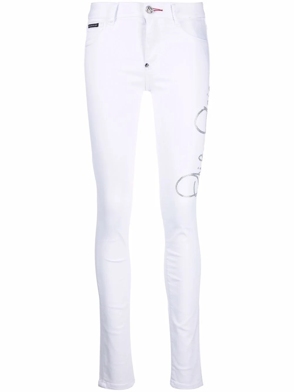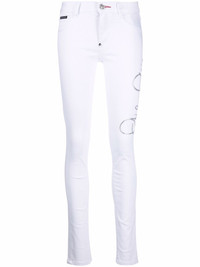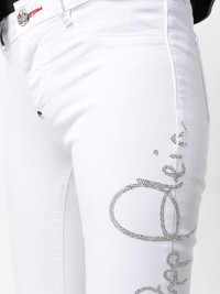 Signature embellished skinny jeans white cotton blend crystal embellishment logo patch to the side low-rise belt loops logo patch to the rear skinny cut Imported Composition glass 100%, Cotton 92%, Polyester 6%, Spandex/Elastane 2% Washing instructions Hand Wash
