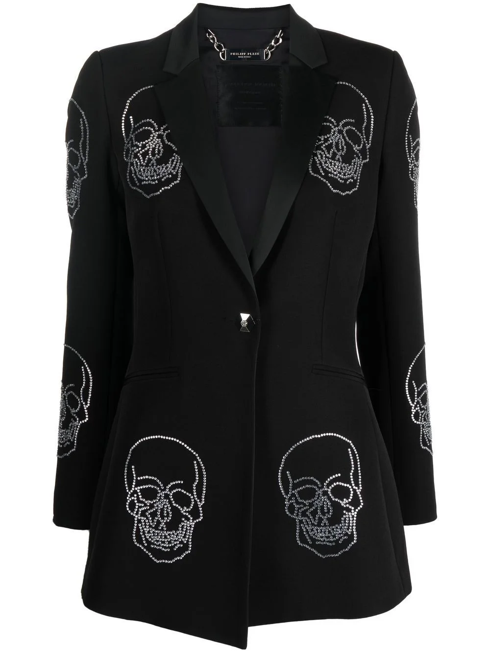 skull-embellished single-breasted coat black glass crystal embellishment skull embellishment two side slit pockets front button fastening notched lapels long sleeves buttoned cuffs asymmetric hem Made in Italy Composition Lining: Viscose 100% Outer: glass 100%, Polyester 88%, Spandex/Elastane 12% Washing instructions Dry Clean Only