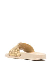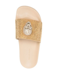 Skull strass pool slides Skull strass pool slides from PHILIPP PLEIN featuring light beige, silver-tone, rhinestone embellishment, skull applique, open toe, slip-on style, branded insole and flat rubber sole. Made in Italy Composition Sole: Rubber 100% Outer: Acrylic 100% Lining: Rubber 100% SIZE & FIT Measurement HEEL 0.59 in(1.5 cm) Sole height 0.39 in(1 cm)