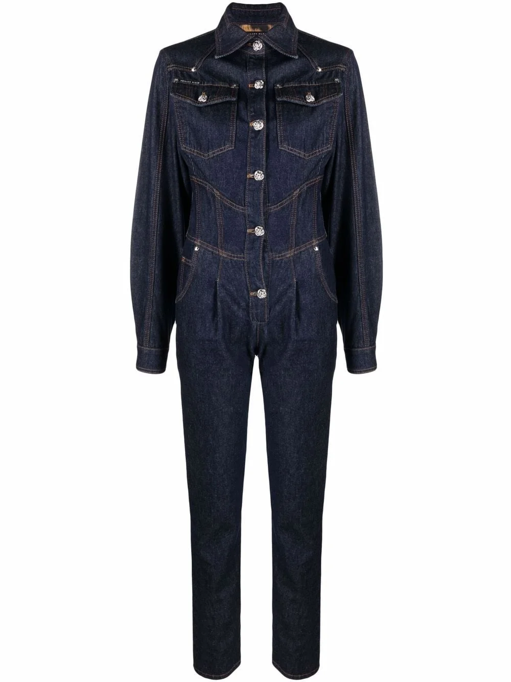 slim-cut denim jumpsuit blue cotton slim cut contrast stitching front button fastening two chest flap pockets long sleeves embroidered logo Imported Composition Lining: Polyester 100% Outer: Cotton 100% Washing instructions Dry Clean Only