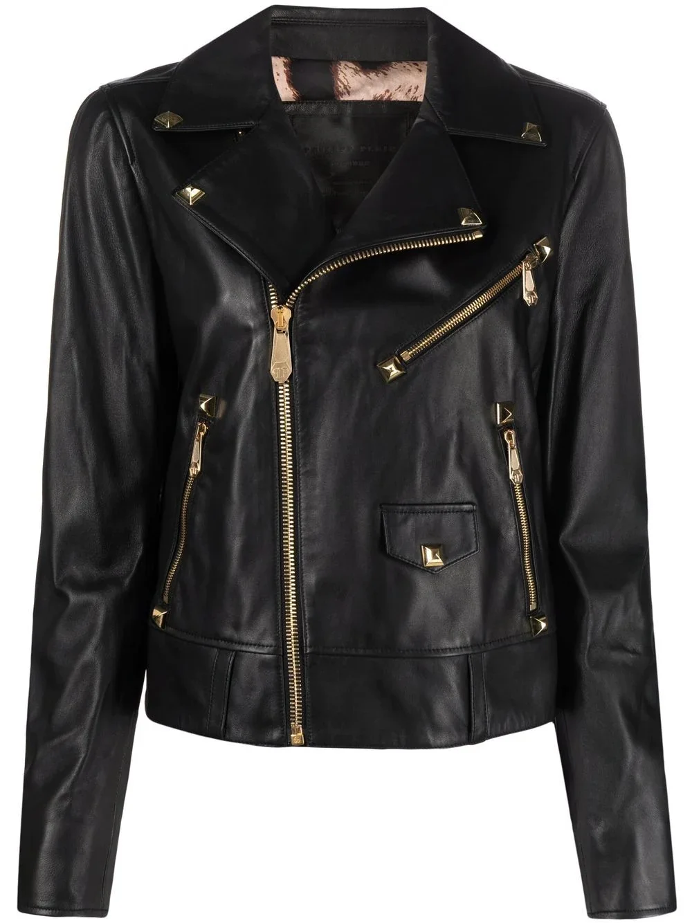 studded biker jacket Philipp Plein presents this black lamb skin biker jacket for SS22. Detailed with edgy gold-tone studs that reflect the designer's rebellious spirit. Highlights - Black - Lamb skin - Studded trim - Notched lapels - Front zip fastening - Side zip-fastening pockets - Leopard print lining Imported Composition Outer: Lamb Skin 100% Lining: Polyester 97%, Spandex/Elastane 3% Washing instructions Specialist Cleaning