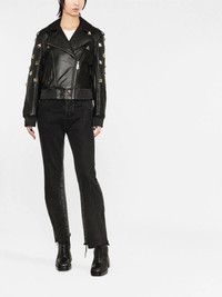 studded leather bomber jacket studded leather bomber jacket from PHILIPP PLEIN featuring black, lambskin, stud embellishment, gold-tone hardware, diamond-quilted detailing, notched lapels, epaulettes, long sleeves, off-centre front zip fastening, two side slit pockets, ribbed trim and leopard print lining. Imported Composition Lining: Polyester 97%, Elastane 3% Outer: Lambskin 100% SIZE & FIT Model measurements Height 5 ft 11 in(1.8 m) Bust/Chest 31.49 in(80 cm) Hips 35.43 in(90 cm) Waist 25.19 in(64 cm) FittingInformation This piece fits true to size. We recommend you get your regular size Cut for a slim fit Made with a mid-weight non-stretch fabric Washing instructions Specialist Cleaning