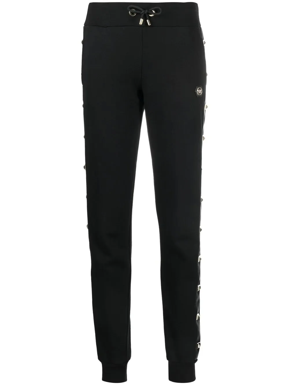 studded side panel track pants black cotton silver-tone stud detailing silver-tone logo plaque elasticated drawstring waistband two side inset pockets elasticated ankles Made in Italy Composition Cotton 100%, Polyurethane 83%, Polyester 12%, Viscose 5% Washing instructions Hand Wash