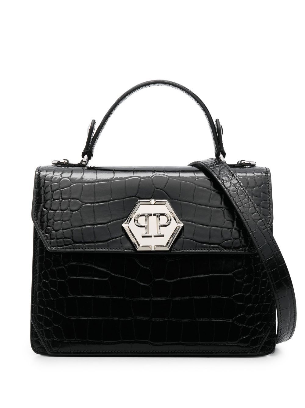 Superheroin crocodile-effect tote bag Superheroin crocodile-effect tote bag from PHILIPP PLEIN featuring black, calf leather, embossed crocodile effect, foldover top, clasp fastening, single circular top handle, single shoulder strap, main compartment and logo plaque to the front . Made in Italy Composition Outer: Calf Leather 100% SIZE & FIT Model measurements Height 5 ft 10 in(1.78 m) Bust/Chest 32.7 in(83 cm) Hips 36.2 in(92 cm) Waist 22.8 in(58 cm) Measurement DEPTH 3.5 in(9 cm) HANDLE 3.9 in(10 cm) HEIGHT 7.9 in(20 cm) STRAP 21.7 in(55 cm) WIDTH 9.4 in(24 cm)
