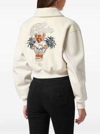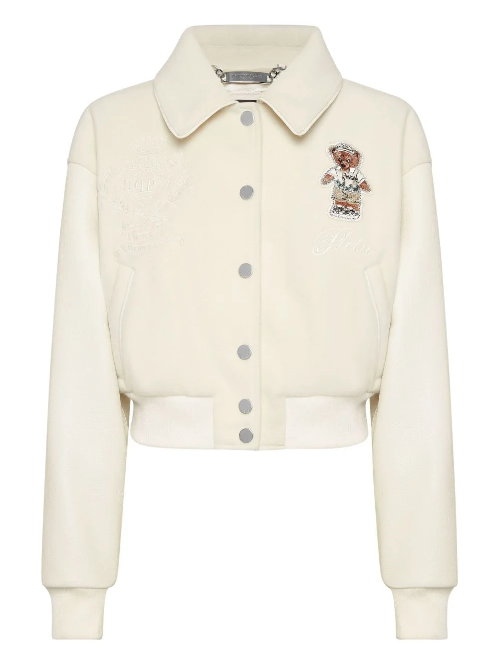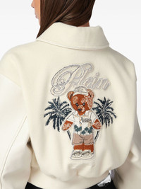 teddy-embellished leather bomber jacket Highlights - Off-white - Leather sleeves - Embroidered lettering - Teddy bear applique - Crystal embellishments - Button fastening Made in Italy Composition Lining: Polyester 97%, Elastane 3% Outer: Polyester 100%, Calf Leather 100% Washing instructions Read Manufacturer Guidelines