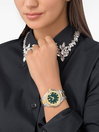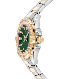 The $kull 41mm Highlights - 41mm - Silver/gold-tone - Stainless steel - Quartz movement - Green dial - Skull applique - Round face - Crystal index - Logo-engraved bezel - Baton hands - Screw-down crown - Two-tone bracelet - Logo-embossed strap - Concealed clasp fastening - This item comes with a standard two-year warranty from the brand. Imported SIZE & FIT Measurement DIAMETER 1.49 in(3.8 cm)
