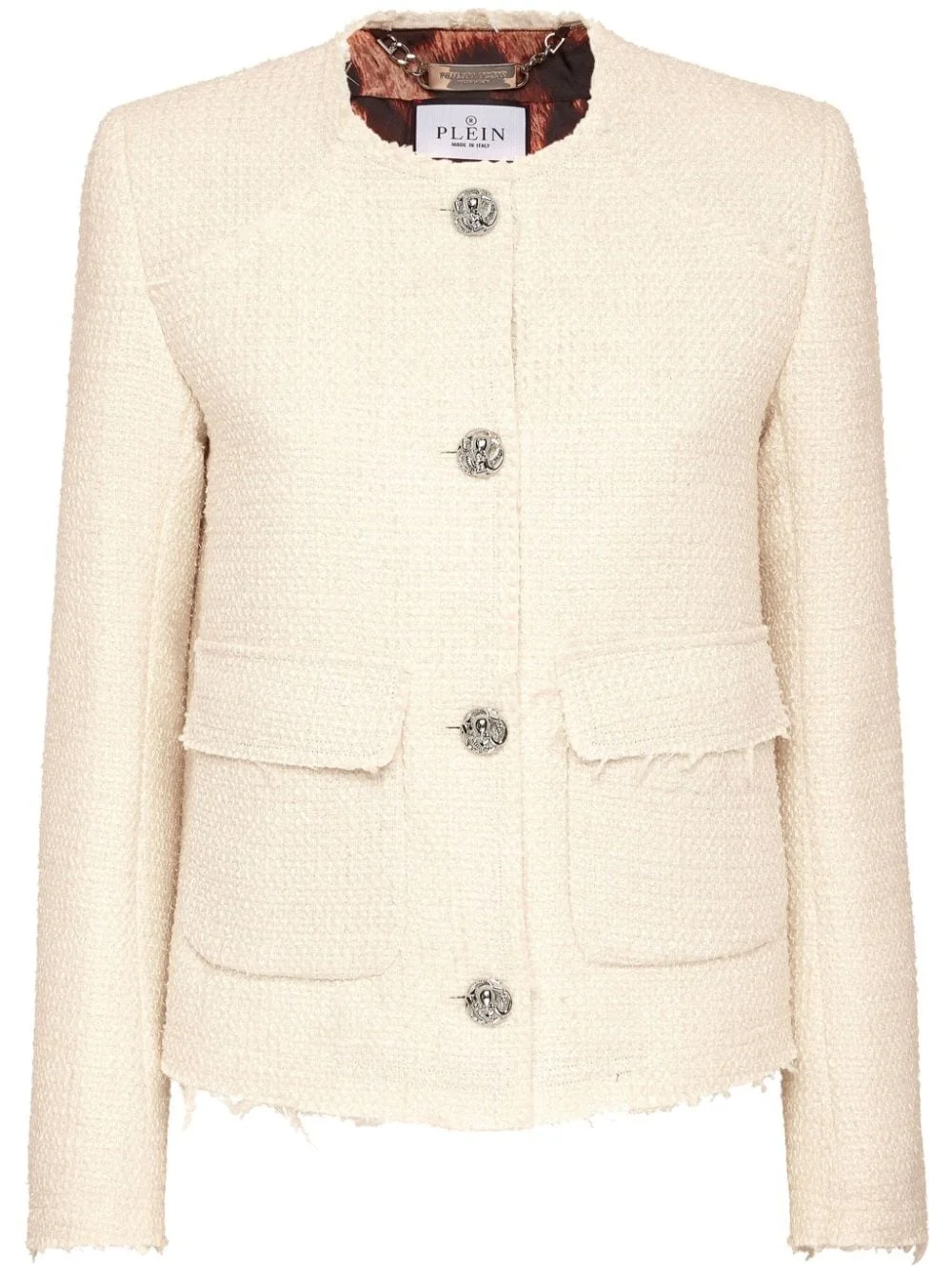 tweed jacket Highlights - Ivory white - Tweed - Raw-cut finish - Embossed silver-tone buttons - Crew neck - Front button fastening - Shoulder pads - Long sleeves - Two side flap pockets - Straight hem - Full lining Made in Italy Composition Outer: Polyester 83%, Acrylic 15%, other fibers 2% Lining: Polyester 100%