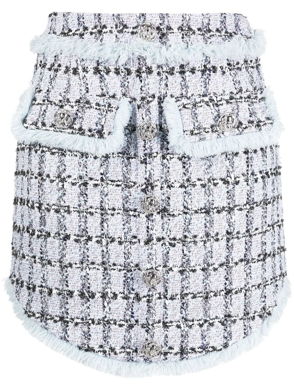 tweed mini skirt light blue/navy blue tweed mid-rise decorative button detailing two front patch pockets asymmetric design Made in Italy Composition Outer: Cotton 25%, Acetate 13%, Metallic Fibre 10%, Polyester 10%, Spandex/Elastane 2% Lining: Polyester 97%, Spandex/Elastane 3% SIZE & FIT Model measurements Height 5 ft 10 in(1.78 m) Bust/Chest 31.49 in(80 cm) Hips 36.22 in(92 cm) Waist 25.59 in(65 cm) FittingInformation This piece fits true to size. We recommend you get your regular size Cut for a slim fit Made with a mid-weight fabric