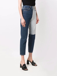 two tone patch jeans light blue cotton blend two-tone design cropped leg belt loops classic five pockets Imported Composition Lining: Polyester 65%, Cotton 35% Outer: Cotton 100% SIZE & FIT Model measurements Height 5 ft 10 in(1.78 m) Bust/Chest 31.49 in(80 cm) Hips 36.22 in(92 cm) Waist 25.59 in(65 cm) FittingInformation This piece fits true to size. We recommend you get your regular size Cut for a slim fit Made with a mid-weight non-stretch fabric Washing instructions Dry Clean Only