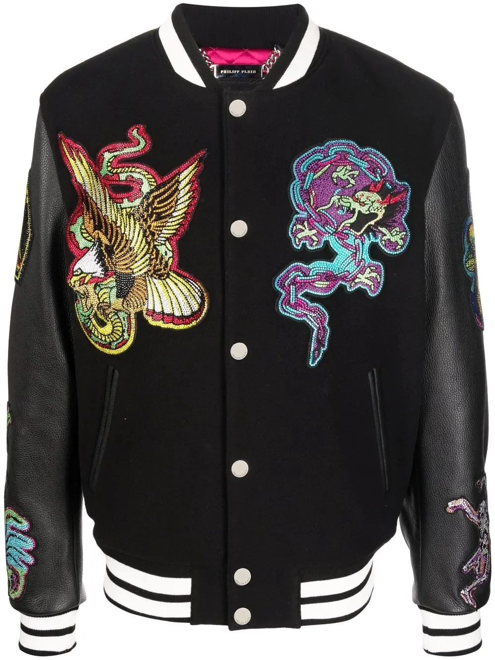 varsity bomber jacket Highlights - Black - Leather blend - Band collar - Front button fastening - Long sleeves - Tattoo patches on the chest, sleeves and rear - Ribbed hem - When buying this unisex item, keep in mind that it is graded in standard men's sizing Imported Composition Outer: Polyester 64%, Fabric 60%, Calf Leather 40%, Viscose 33%, Elastane 3% Lining: Polyester 100% Washing instructions Specialist Cleaning