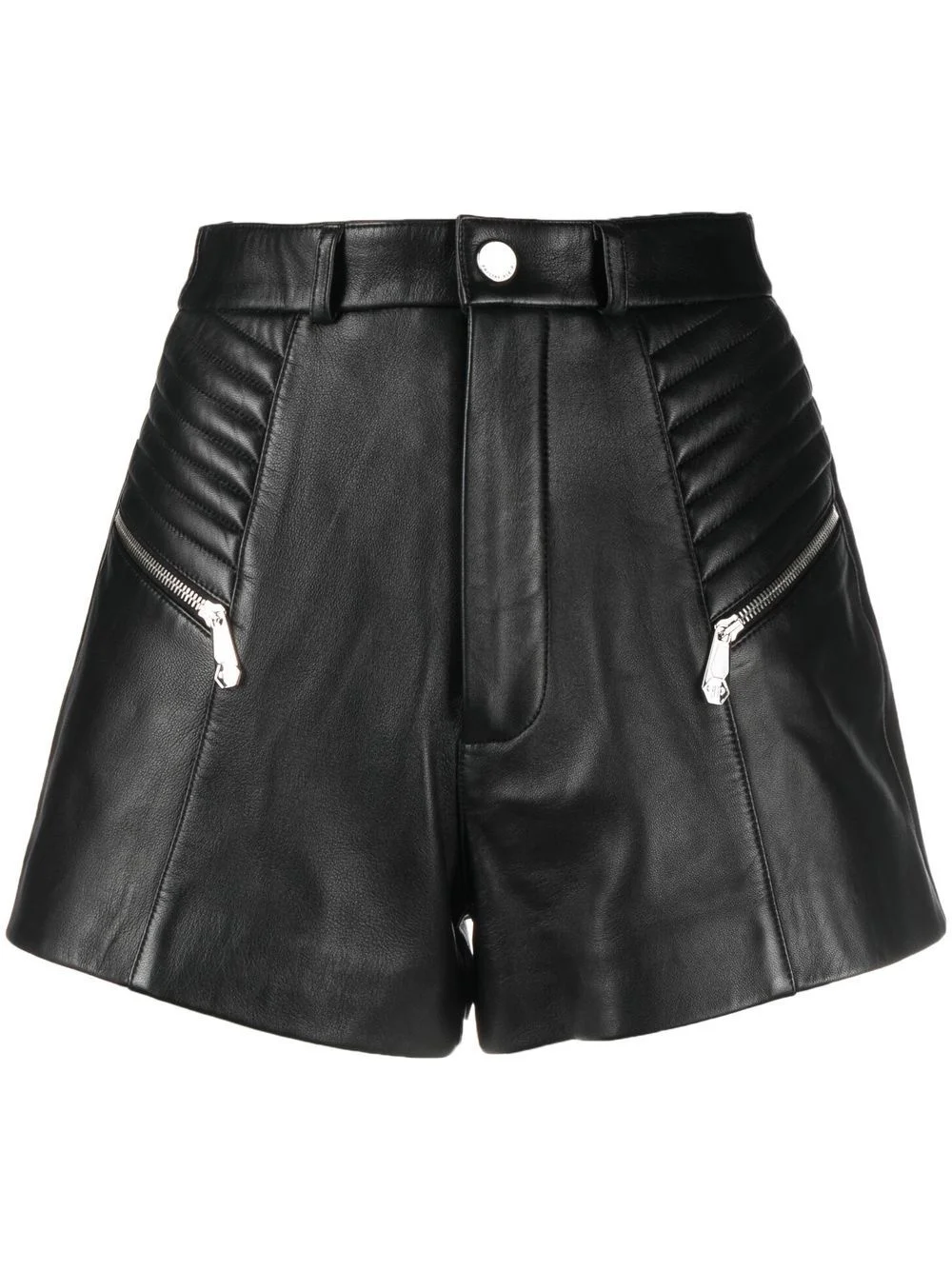 zipper-detail leather shorts black lambskin front button and zip fastening belt loops two zip-fastening pockets above-knee length Imported Composition Outer: Lamb Skin 100% Lining: Acetate 100% Washing instructions Specialist Cleaning