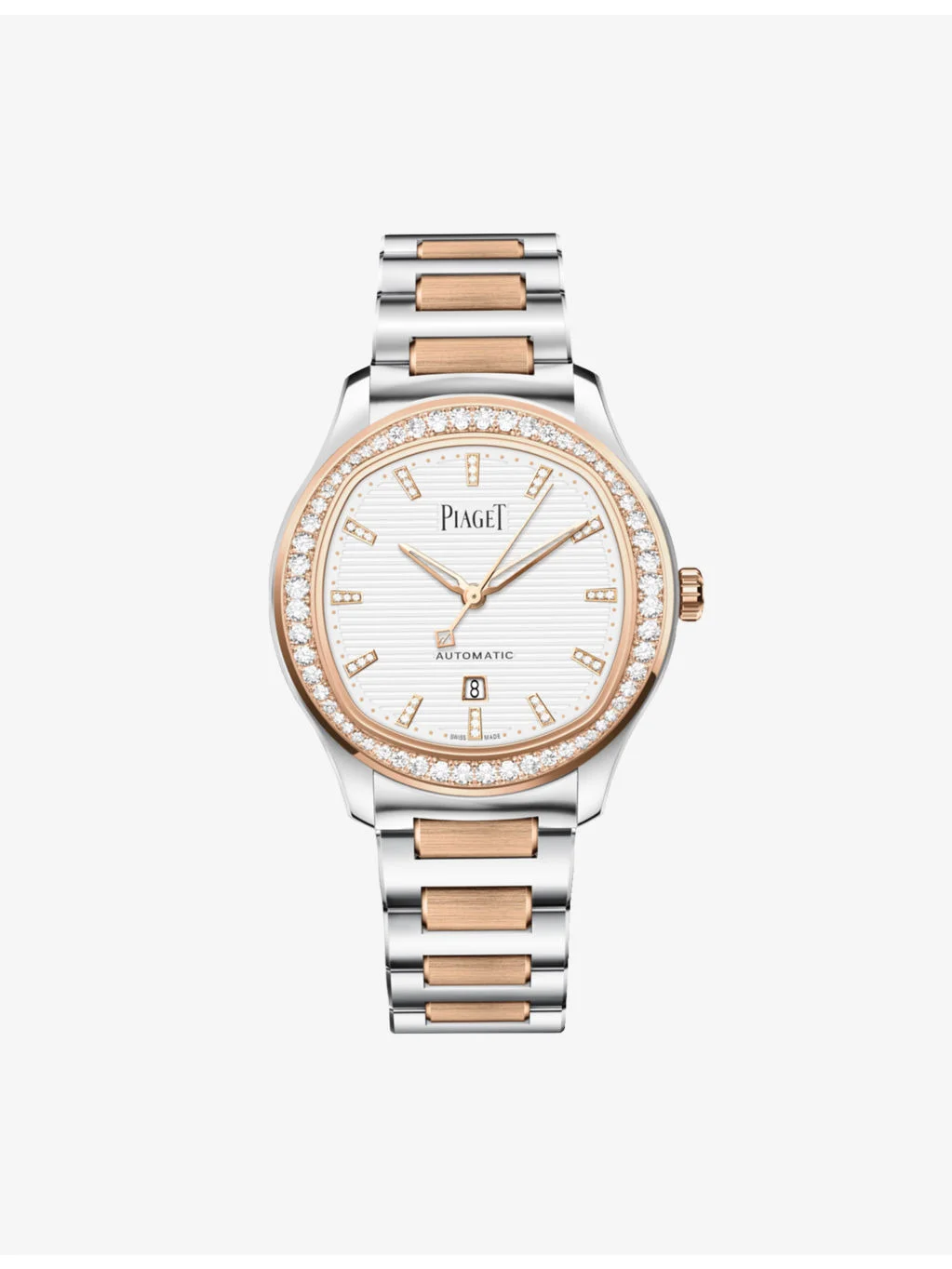 PRODUCT DETAILS - Piaget 18ct Rose-Gold, Stainless Steel And Diamond Watch - Case material: 100% rose gold; 100% stainless steel with 60 0.97ct brilliant-cut diamonds - Crown: 100% rose gold - Bezel: 100% rose gold; 100% stainless steel - Style Number: PGG0A48026 - Fastening: triple folding clasp - Movement type: self-winding - Dial: white dial with pink gold and 36 brilliant-cut 0,07ct diamond-set indexes - Index: pink gold diamond-set indexes - Hands: hours, minutes, small seconds - Glass: sapphire crystal - Calibre: mechanical movement - Case dimensions: 36mm - Case thickness: 8.8mm - Stones: 96 diamonds - Water resistance: Water-resistant to 50m - Made in: Switzerland - Warranty: 8 Years Ref: R04538704
