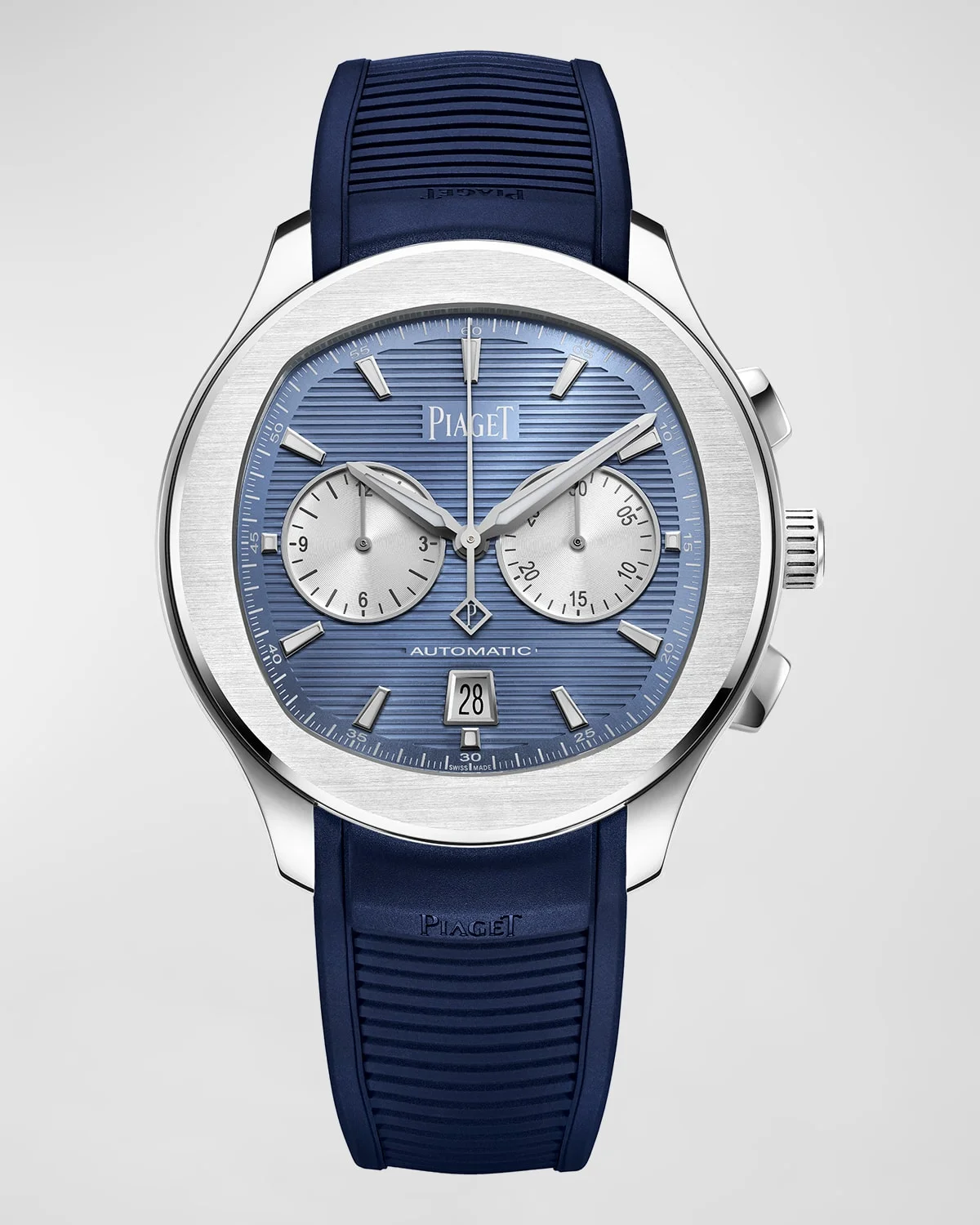 PIAGET Polo chronograph watch Case dimensions: approx. 42mm Stainless steel case and hardware Blue guilloche dial with 12 o'clock logo text Baton indices as hour and second markers Two round subdials in silvertone Square date indicator at 6 o'clock index Threehand 1160P automatic movement Blue rubber strap with thorn buckle Power reserve of 50 hours Sapphire crystal case back Water resistant to 10 ATM Made in Switzerland Care Instructions: Take your watch off before you swim in seawater or use cosmetics. To clean your watch case and metal bracelet, simply wipe with a little soapy water (on a waterproof watch only) and dry with a soft cloth.