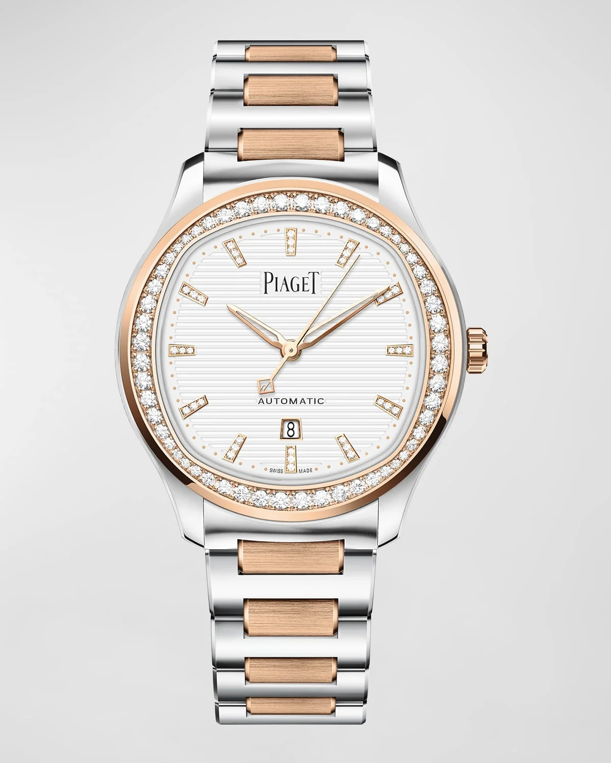 - PIAGET two-tone bracelet watch - Case dimensions: approx. 36mm - Stainless steel and 18-karat rose gold - 60 brilliant-cut diamonds at the bezel; 0.97 total carat weight - White dial with diamond indices set in 18-karat rose gold - 36 brilliant-cut diamonds; 0,07 total carat weight - Signature logo text at 12 o'clock - Square date window at 6 o'clock - H-link bracelet strap with folding closure - 500P1 manufacture self-winding mechanical movement - Sapphire crystal case back - Power reserve of 40 hours - Water resistant to 5 ATM - Made in France - Care Instructions: - Take your watch off before you swim in seawater or use cosmetics. To clean your watch case and metal bracelet, simply wipe with a little soapy water (on a waterproof watch only) and dry with a soft cloth. - Piaget Style # G0A48026
