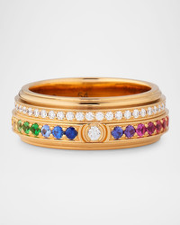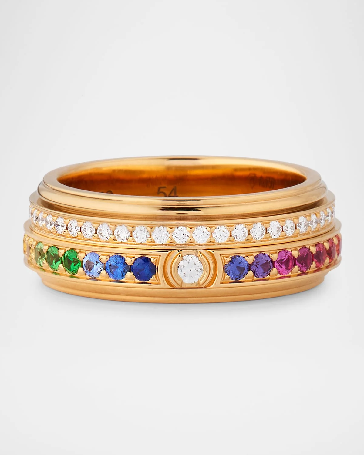 - Possession ring from PIAGET - Polished 18-karat rose gold - 48 brilliant-cut diamonds; 0.35 total carat weight - Seven sapphires; 0.18 total carat weight - Six yellow sapphires; 0.16 total carat weight - Six green tsavorites; 0.12 total carat weight - Four orange sapphires; 0.10 total carat weight - Four pink sapphires; 0.10 total carat weight - Four purple sapphires; 0.10 total carat weight - Two pink rubies; 0.05 total carat weight - Possession-set brilliant-cut diamond; 0.03 total carat weight - Wipe clean - Made in France