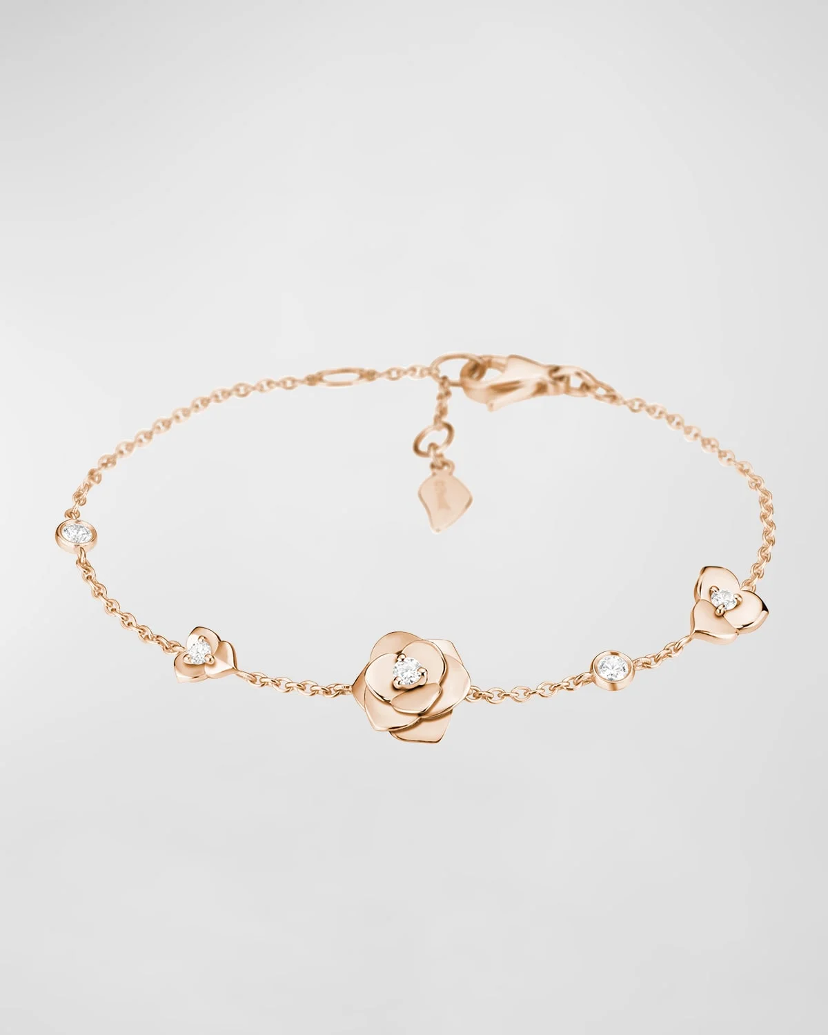 - Discover this Piaget Rose Rose Gold Diamond Bracelet. The buds and flowers on this luxury bracelet are placed asymmetrically along the chain, recreating an audacious bouquet. Each petal and motive is crafted in different shapes and enhanced with small diamonds that sit like morning dew. A dainty and delicate celebration of Yves Piaget's favorite bloom, the rose. - PIAGET bracelet - 18-karat solid rose gold - Five brilliant-cut diamonds - Total diamond carat weight: 0.26 - Lobster clasp; adjustable length - Made in France - Piaget style # G36U6300