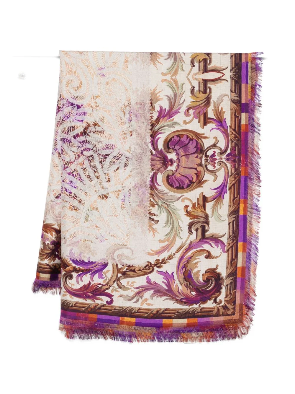 floral-pattern scarf Highlights - Purple - Floral print - Lace detail - Fringed trim Made in Italy Composition Silk 100% SIZE & FIT Measurement WIDTH 53.14 in(135 cm) LENGTH 76.77 in(195 cm)