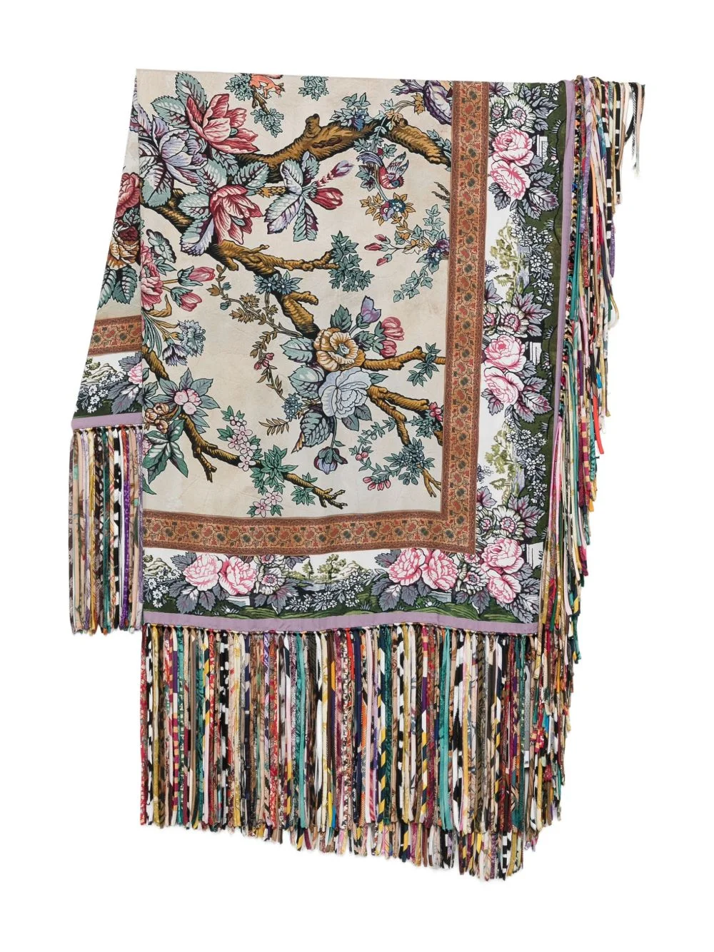 floral-print fringed scarf Highlights - Beige - Floral pattern - Multicolored fringe - Fringe detail Imported Composition Fabric 100% SIZE & FIT Measurement LENGTH 53.14 in(135 cm) WIDTH 53.14 in(135 cm) Washing instructions Read Manufacturer Guidelines