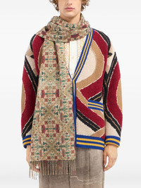 geometric-pattern fringed-edges scarf Highlights - Beige - Geometric pattern - Fringed edges - Wool cashmere blend - Rectangular shape Imported Composition Wool 85%, Cashmere 15% SIZE & FIT Measurement LENGTH 72.83 in(185 cm) WIDTH 13.77 in(35 cm) Washing instructions Read Manufacturer Guidelines