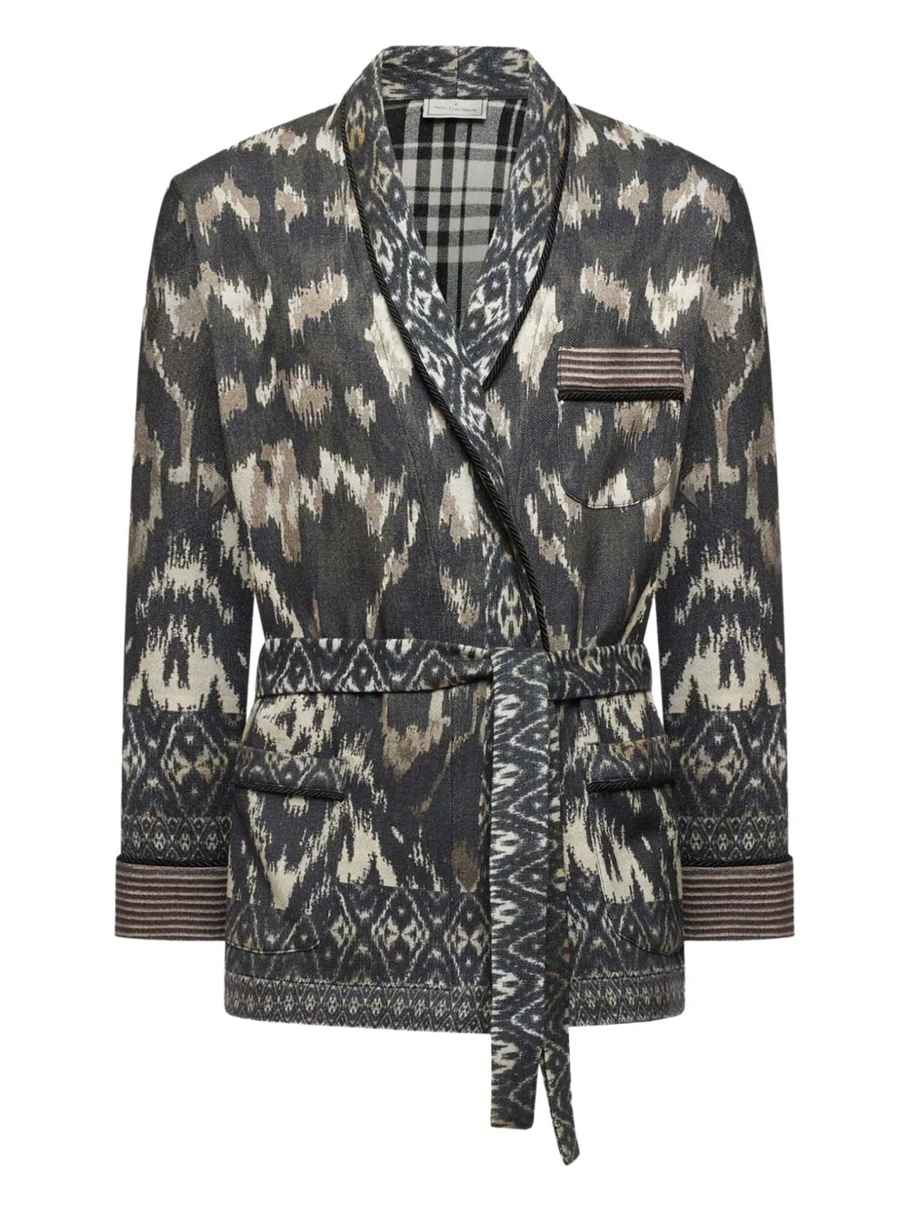 ikat-pattern belted jacket Highlights - Dark-grey - Ikat pattern - Shawl collar - Self-tie belt - Piped trim Imported Composition Wool 100% Washing instructions Read Manufacturer Guidelines