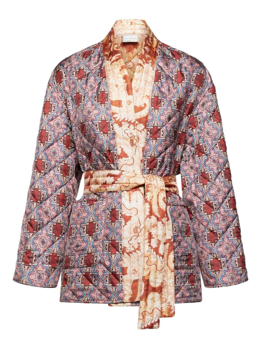 quilted patterned coat Highlights - Pink - Quilted design - Geometric pattern - Contrasting floral panel - Self-tie belt - Open front Imported Composition Silk 100% Washing instructions Read Manufacturer Guidelines