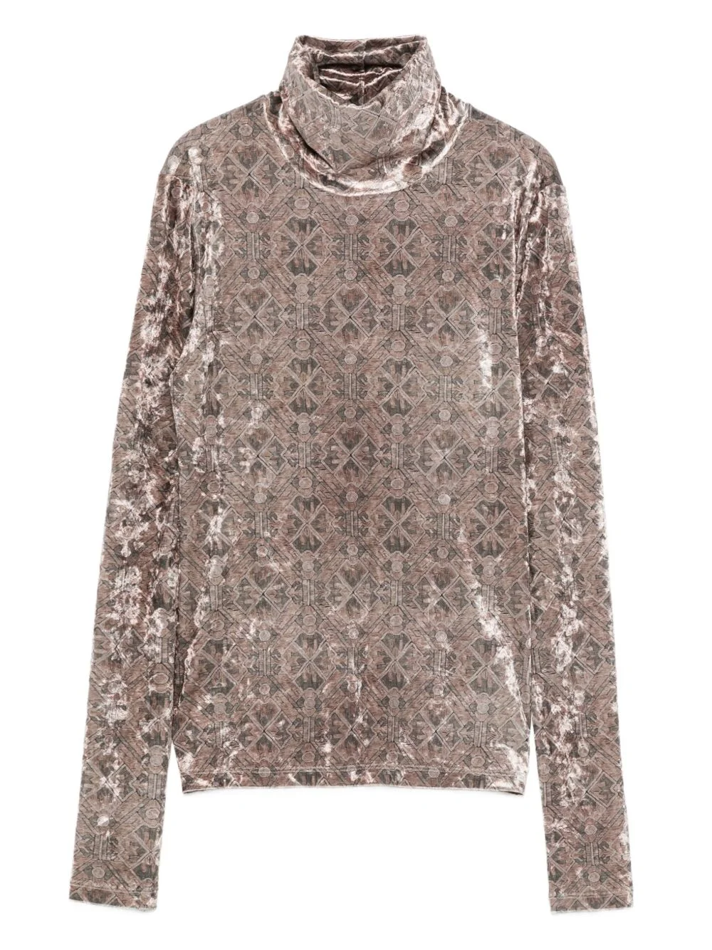 geometric-pattern velvet top Highlights - Taupe - Velvet texture - Geometric pattern - Turtleneck - Long sleeves Made in Italy Composition Polyester 92%, Elastane 8% SIZE & FIT Model measurements Height 5 ft 11 in(1.8 m) Bust/Chest 31.49 in(80 cm) Hips 36.61 in(93 cm) Waist 24.4 in(62 cm) Washing instructions Dry Clean Only